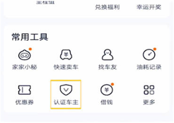 第一步,点击认证车主当我们打开软件之后,我们找到常用工具栏目,然后在里面找到认证车主的选项。