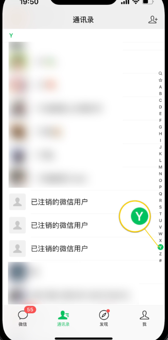 2、点击“联系人”,将好友列表滑到“Y”。