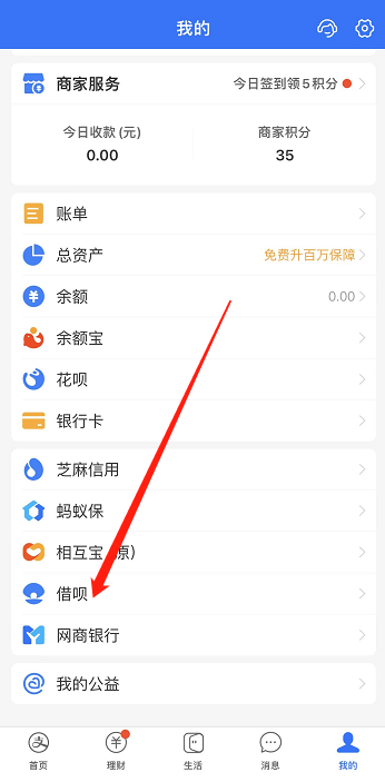 1、该功能目前还在内测,用户需要进入到支付宝中,选择“我的”,找到“借呗”。