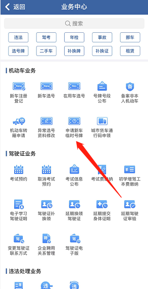 1、进入到主页中,找到“业务中心”,选择“申请新车临时号牌”。