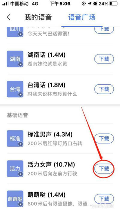 在语音广场页面中,用户可以选择喜爱的语音类型,下载完成后,即可点击使用更换导航语音。