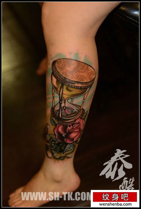 女人腿部精致个性的沙漏与玫瑰纹身图案