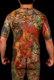 男孩背部浅色麒麟满背纹身图片