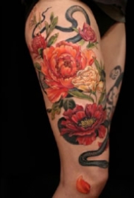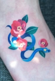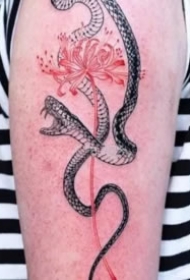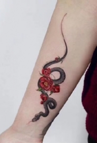 精美的小黑蛇与红色花朵的刺青图案作品图片图片