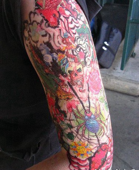 手臂锦鲤和蜘蛛的彩色套纹身图片