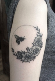 刺青图案花朵 男生大臂上彩色的花朵和蜜蜂纹身图案