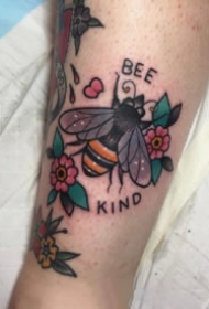 男生小腿上黑色线条素描创意蜜蜂精致花体英文纹身图案