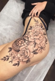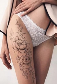 女生大腿上黑色线条素描文艺唯美精致花朵纹身图案
