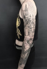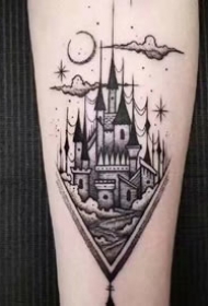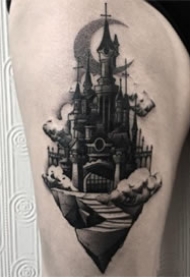 欧美大黑灰风格的城堡建筑系纹身图案作品