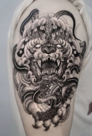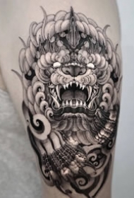 神兽报喜,传统唐狮牡丹半甲刺青图片