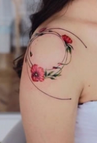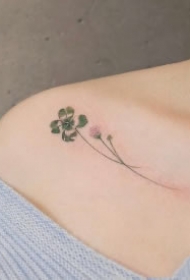 女性左肩上彩色的小清新植物刺青四叶草纹身图案