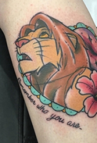 动画狮子王刺青 女生小腿上花朵和狮子王纹身图案