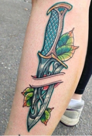 小腿对称刺青 女生小腿上叶子和匕首刺青图案