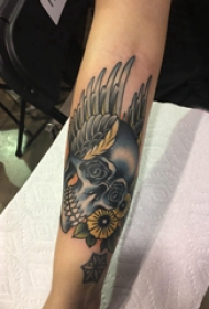骷髅刺青 女生手臂上花朵和骷髅纹身图案