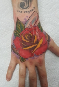 手背刺青 男生手背上彩色的玫瑰纹身图案
