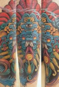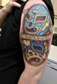 刺青面具 男生大臂上彩色的英文和面具纹身图案