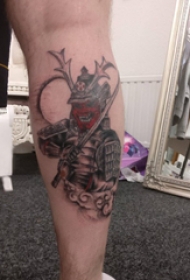 武士刺青 男生小腿上彩色的般若武士纹身图案