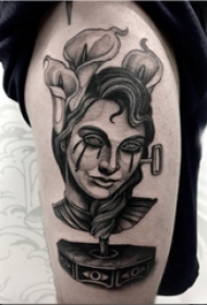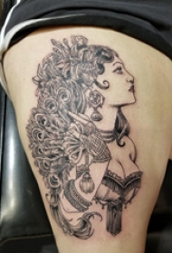 大腿传统刺青 女生大腿上黑色的人物肖像纹身图案