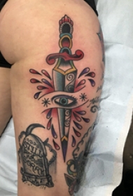 大腿传统刺青 女生大腿上眼睛和匕首纹身图案