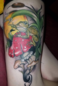 彩绘刺青 女生大腿上蘑菇和青蛙纹身图案