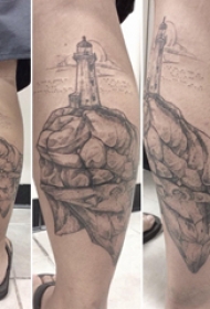 小腿对称刺青 男生小腿上黑色的灯塔纹身图案