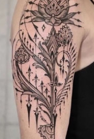 手臂上的点刺风格曼陀罗梵花纹身图片