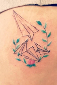 女生后背上黑色点刺几何简单线条纸飞机纹身图案