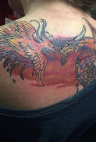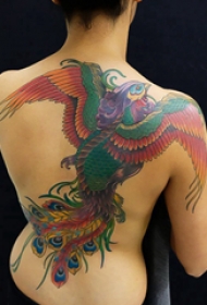 刺青后背女 女生后背上彩色的凤凰纹身图案