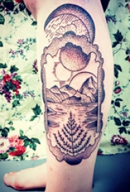 风景刺青 女生小腿上黑灰的风景纹身图案