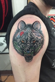 后肩刺青 男生后肩上圆形和风景纹身图案