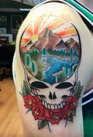 双大臂刺青 男生大臂上骷髅和风景纹身图案