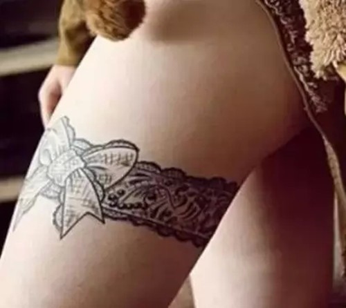 性感黑色蕾丝纹身 大腿蕾丝蝴蝶结纹身