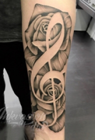 音符刺青 女生手臂上花朵和音符纹身图案