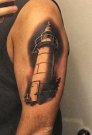 大臂刺青图 男生大臂上黑色的灯塔纹身图案
