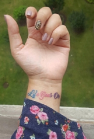 花体英文刺青 女生大腿上黑色的英文纹身图案