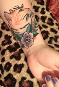 小清新猫咪刺青 女生手臂上花朵和猫咪纹身图案