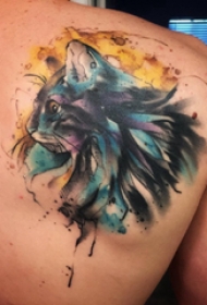 后背刺青男 男生后背上彩色的猫咪纹身图案