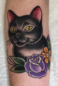 刺青点刺技巧 女生小腿上花朵和猫咪纹身图案
