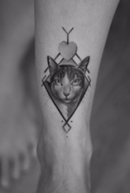 欧美线条刺青 女生小腿上菱形和猫咪纹身图案