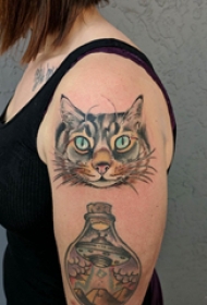 双大臂刺青 女生大臂上飞碟和猫咪纹身图案