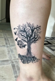 欧美小腿刺青 女生小腿上南瓜和大树纹身图案