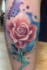 小腿对称刺青 女生小腿上彩色的玫瑰纹身图案