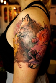 双大臂刺青 女生大臂上花朵和狐狸纹身图案