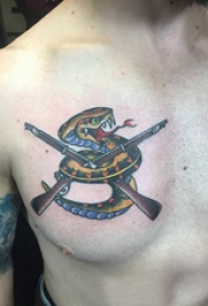 刺青胸部男 男生胸部彩色的枪和蛇纹身图案