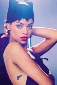 美国刺青明星 蕾哈娜侧腰上黑色的枪纹身图案