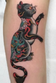 个性日式刺青 男生大臂上彩绘猫和般若的纹身图片