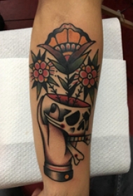 大腿刺青传统 女生大腿上手部和骷髅纹身图案