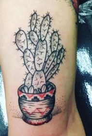 植物刺青 女生大腿上彩色的仙人掌纹身图案
