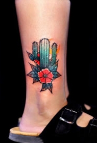仙人掌刺青 女生脚踝上彩色的仙人掌纹身图案
