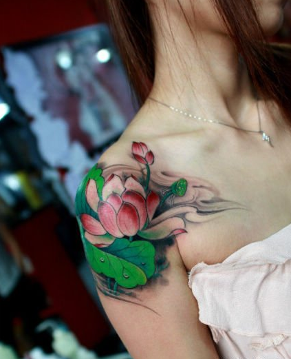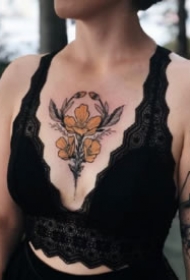 性感花胸刺青 女生胸部性感的肩花和花胸纹身图片